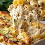 This recipe serves about 4 to 6 people as a main course. To double the batch, use a larger casserole and extend baking time by 5–7 minutes, checking for bubbling cheese. If halving, a smaller dish works great, and the baking time shrinks by a few minutes. For metric conversions: 12 oz pasta is about 340 grams, 1 ½ cups Alfredo sauce roughly 360 ml, and 3 cups cooked chicken ~360 grams.