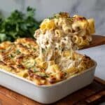 A creamy and flavorful Banana Pepper Chicken Alfredo Bake combining tender chicken, al dente pasta, cheesy Alfredo sauce, and tangy banana peppers for a comforting and easy dinner.