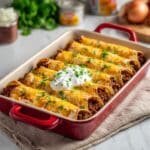 Delicious and hearty Beefy Enchiladas featuring seasoned ground beef, melted cheddar cheese, and flavorful enchilada sauce wrapped in corn tortillas, baked to perfection for a comforting Mexican-inspired meal.