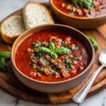 A hearty and flavorful Beefy Tomato Soup made with ground beef, crushed tomatoes, and aromatic seasonings. Perfect for a comforting meal, this soup combines savory beef broth with Italian herbs and is garnished with fresh basil or parsley for an added fresh touch.