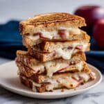 A delicious brunch panini featuring melted Brie cheese, crispy bacon, fresh apple slices, and a touch of honey, all grilled to golden perfection for a warm and flavorful sandwich.