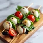 Delicious and easy-to-make Caprese Skewers, featuring fresh cherry tomatoes, mozzarella pearls, and basil leaves, drizzled with a tangy balsamic glaze and a touch of black pepper. Perfect as a refreshing appetizer or party snack.