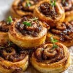 These Caramelized Onion & Thyme Pinwheels are a delightful appetizer featuring flaky puff pastry filled with sweet, caramelized onions and fragrant fresh thyme. Perfect for entertaining or as a savory snack, these pinwheels offer a deliciously buttery texture combined with rich, herbal flavors.