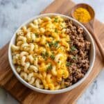 A comforting and hearty dish combining browned ground beef, tender macaroni, and creamy melted cheddar cheese, flavored with mustard powder and seasoned to taste. Perfect for a quick and satisfying dinner.