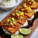This Coconut Crusted Salmon recipe features crispy salmon fillets coated in a crunchy coconut and panko breadcrumb crust, served with a vibrant and fresh pineapple salsa. Perfectly cooked either baked or pan-fried, it offers a delightful balance of textures and tropical flavors that make for a healthy and satisfying main course.