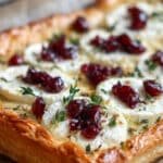 This Cranberry Brie Tart with Pancetta & Thyme is a delightful appetizer featuring flaky puff pastry topped with creamy Brie cheese, tangy cranberry sauce, crispy pancetta, and fragrant fresh thyme. Perfect for holiday gatherings or special occasions, this tart combines sweet, savory, and herbal flavors baked to golden perfection.