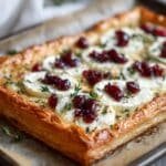 This Cranberry Brie Tart with Pancetta & Thyme is a delightful appetizer featuring flaky puff pastry topped with creamy Brie cheese, tangy cranberry sauce, crispy pancetta, and fragrant fresh thyme. Perfect for holiday gatherings or special occasions, this tart combines sweet, savory, and herbal flavors baked to golden perfection.