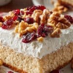 When you’re ready to serve, spread the thawed whipped topping in an even layer over the cranberry-soaked cake. I like to sprinkle dried cranberries and chopped walnuts on top for crunch and an extra burst of berry flavor. Let it rest in the fridge for about 15 minutes before slicing so the whipped topping firms up slightly but still stays light and airy. You’ll notice how the cake feels moist but not soggy, and the topping balances the tang of the cranberries with creamy sweetness.
