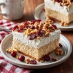 A festive Cranberry Sauce Poke Cake featuring a moist yellow cake infused with warm spices, filled with tangy whole berry cranberry sauce, and topped with creamy whipped topping, dried cranberries, and crunchy walnuts. Perfect for holiday gatherings or any special occasion.