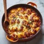 This French Onion Gnocchi recipe features tender, store-bought gnocchi tossed in a rich caramelized onion sauce with thyme, garlic, white wine, and a blend of cheeses including Gruyère and Parmesan. The sauce is slowly simmered to develop deep flavors, then finished under the broiler for a bubbly, golden cheese topping. Perfect served with crusty bread, mashed potatoes, or a fresh salad for a comforting meal.