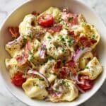 This Fresh Grinder Tortellini Salad is a flavorful and hearty dish featuring al dente cheese tortellini tossed with a zesty homemade dressing, crispy crumbled bacon, tangy pepperoncini peppers, fresh grape tomatoes, red onion, and Parmesan cheese. Perfectly chilled for an hour to meld the vibrant flavors, this salad makes an excellent side dish or a light main course for any occasion.