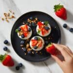 Add toppings: Evenly distribute blueberries, sliced strawberries, and sprinkle granola on each yogurt dollop.