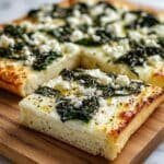 A delicious Greek-inspired roasted garlic spinach white pizza featuring a creamy garlic-ricotta sauce, sautéed spinach, and a blend of mozzarella, feta, and Parmesan cheeses on a crispy pre-made crust. This easy-to-make vegetarian pizza offers a flavorful twist with roasted garlic and fresh herbs, perfect for a satisfying meal.