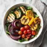 A vibrant and healthy Grilled Vegetable Salad featuring tender zucchini, bell pepper, red onion, and cherry tomatoes, tossed with mixed greens and a drizzle of balsamic glaze. Perfect as a light lunch or side dish, this salad combines smoky grilled flavors with fresh greens for a delicious and nutritious meal.