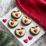 Festive and fun Grinch Christmas Pretzels featuring mini pretzel twists dipped in vibrant green candy melts and adorned with red heart sprinkles. Perfect as a sweet and salty holiday treat that's quick to make and delightful to share.