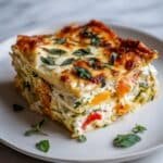A nutritious and delicious high-protein veggie lasagna featuring zucchini, bell peppers, spinach, and a blend of creamy cheeses. This recipe layers sautéed vegetables with ricotta, mozzarella, and parmesan, baked to golden perfection for a satisfying vegetarian main course.