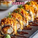 - Add the Crunch: Brush the top of the sushi roll with spicy mayo or eel sauce to add flavor and help the crunchy topping adhere. Sprinkle toasted panko breadcrumbs or fried onions generously over the brushed surface. Lightly press the topping onto the roll using the bamboo mat to ensure it sticks well.