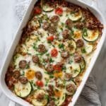 A flavorful Keto Zucchini and Sausage Casserole featuring tender zucchini slices, savory Italian sausage, and melty mozzarella and Parmesan cheeses, baked to golden perfection. This low-carb casserole is creamy, comforting, and perfect for a satisfying main course.