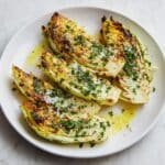 Melted Cabbage is a simple and delicious side dish featuring thick cabbage wedges roasted until golden and caramelized, brushed with a flavorful garlic butter mixture, and topped with melted parmesan and fresh parsley.