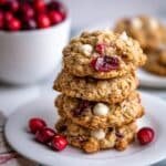 These Oatmeal Cranberry Cookies combine the chewy texture of old fashioned oats with the tartness of fresh cranberries, crunchy pecans, and sweet white chocolate chips for a delightful treat perfect for any snack or dessert occasion.