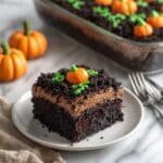 A festive Pumpkin Patch Cake featuring a moist chocolate cake base with creamy chocolate pudding filling, topped with crushed Oreos for soil, green buttercream vines, and adorable candy pumpkins, perfect for a fall celebration or Halloween party.