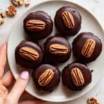 Delicious and easy No-Bake Pecan Pie Bites made with pecans, dates, and a touch of cinnamon, coated in smooth melted chocolate for a perfect sweet snack or dessert.