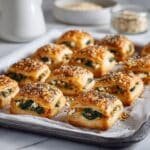 Delightful spinach and feta puff pastry bites featuring a creamy filling wrapped in golden, flaky pastry, perfect as an appetizer or snack for any occasion.