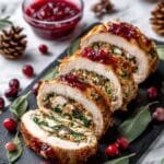 This stuffed pork tenderloin recipe combines sweet caramelized onions, spinach, garlic, tangy cranberry sauce, and creamy goat cheese for a flavorful holiday main course. The pork is butterflied, filled with the savory and sweet mixture, rolled, tied, seasoned, and roasted to juicy perfection. It's an elegant yet approachable dish perfect for special occasions.