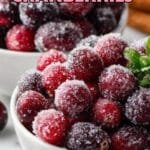 Sugared cranberries keep best stored in an airtight container at room temperature for up to 3 days. They don’t freeze well because the sugar coating loses its crunch and the berries become mushy after thawing. If you want to prepare ahead, do the syrup step but wait to sugar coat your berries until just before serving to keep that fresh texture intact.