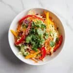 Combine Vegetables and Noodles: In a large bowl, mix the cooled noodles with julienned carrots, sliced red bell pepper, julienned cucumber, shredded red cabbage, and chopped fresh cilantro.